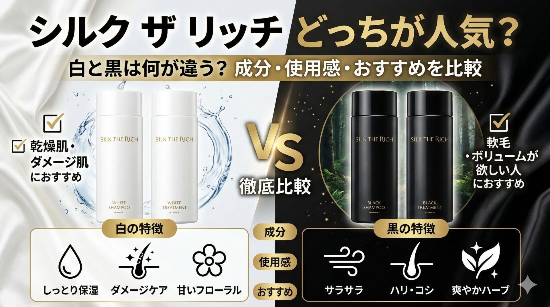 シルクザリッチどっちが人気?白と黒は何が違う?成分・使用感・おすすめを比較
