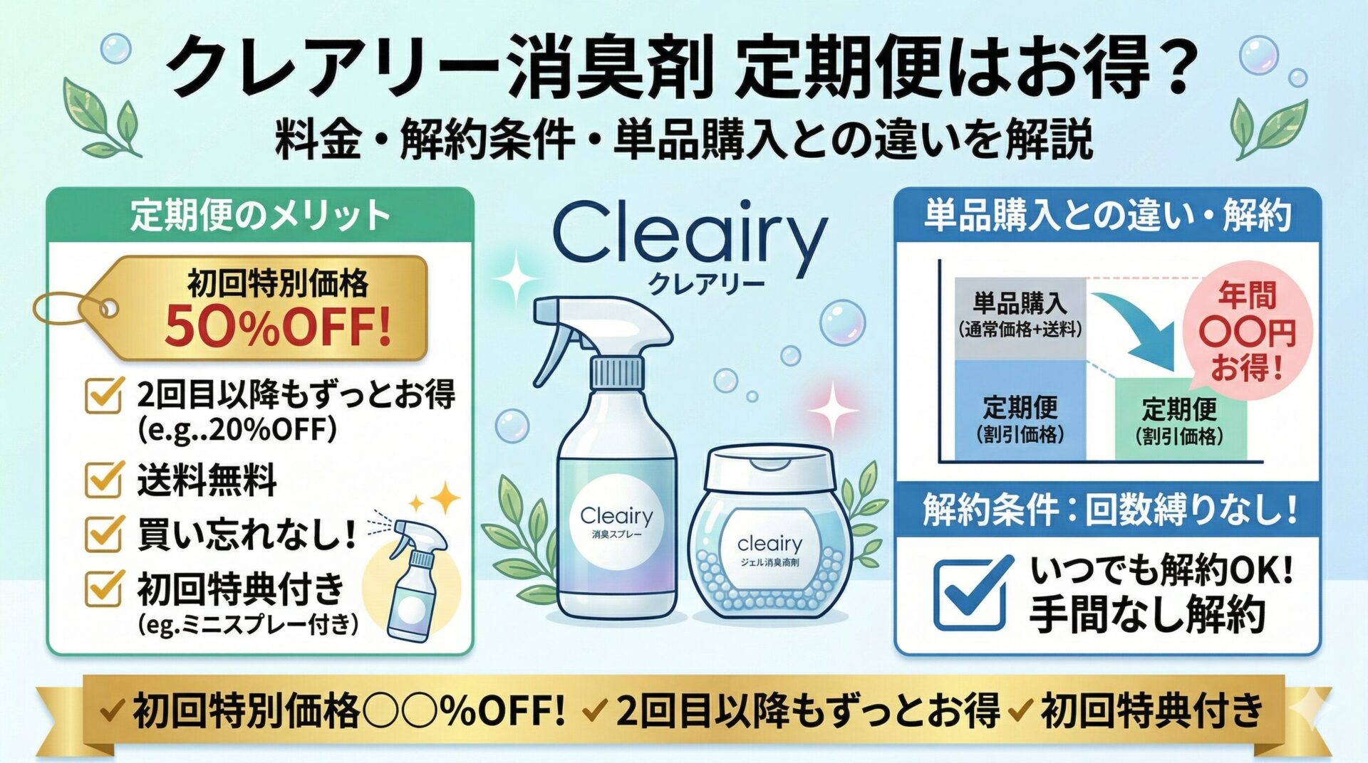 結論からいうと、クレアリー消臭剤の定期便は、継続して使う前提なら料金を把握しやすく、解約条件も先に確認しやすいコースです。